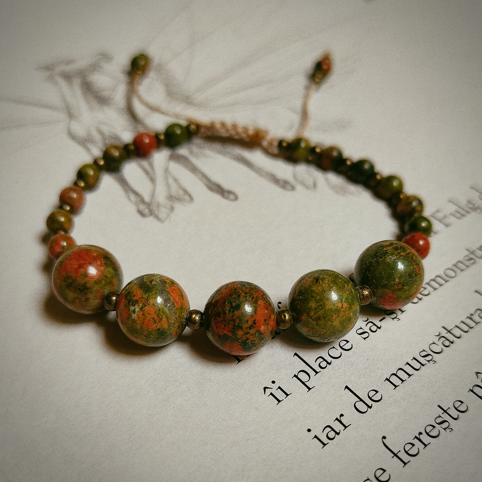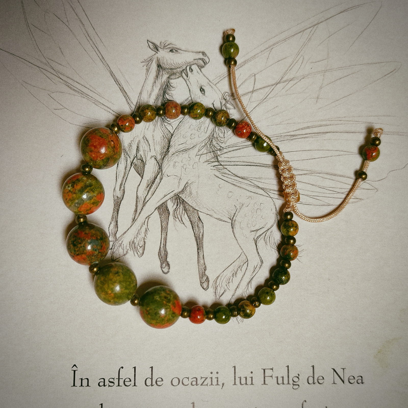 O brățară deosebită din unakit. Completează perfect orice ținută pe care o alegeți pentru îmbrăcămintea de zi cu zi, pentru o petrecere casual sau orice altă ocazie specială la care doriți să participați. Poate fi, de asemenea, un cadou ideal pentru prieteni sau rude.