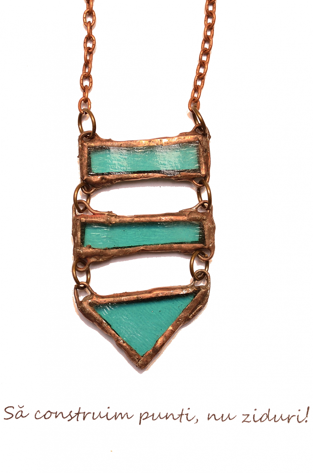 Colier din sticlă verde Cathedral și cupru. Nu conține plastic. Colierul este unicat, facut manual. sticla este colorată in compoziție (nu este vopsită).