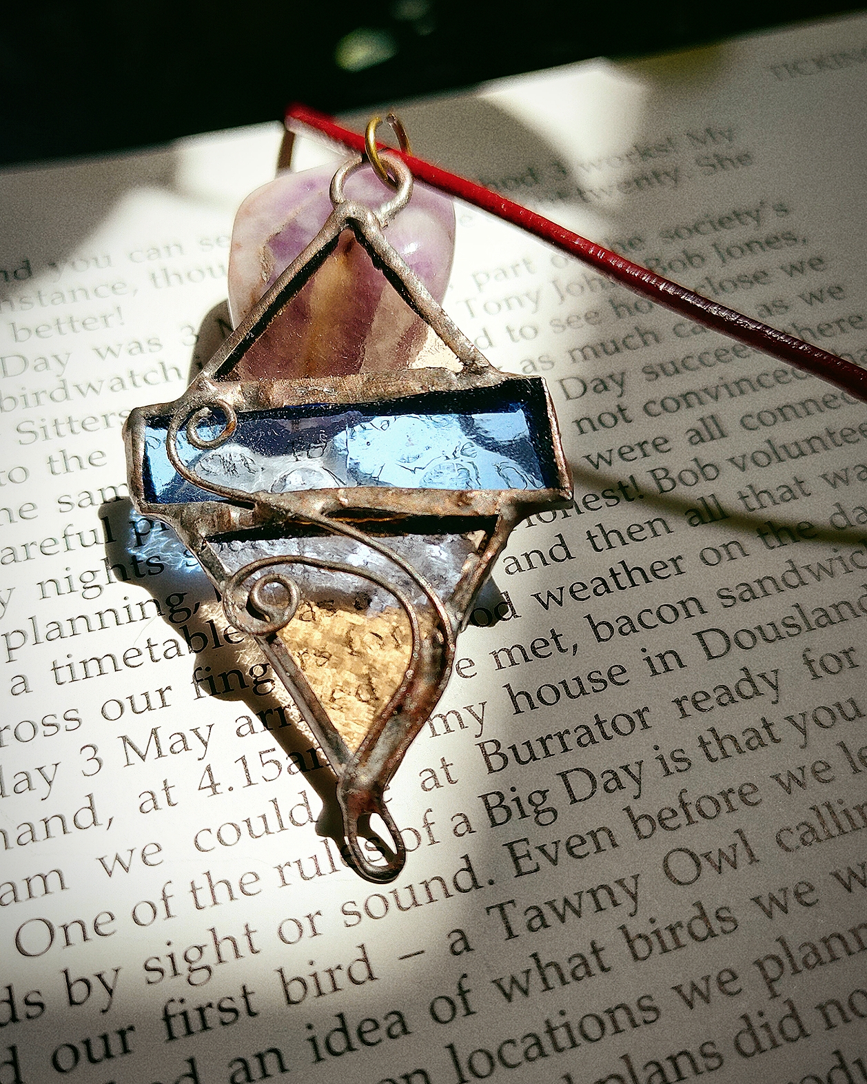 Colier din sticlă Cathedral colorată albastru și galben. Nu conține plastic. Colierul este unicat, facut manual. sticla este colorată in compoziție (nu este vopsită). Colier in tehnică de vitraliu.