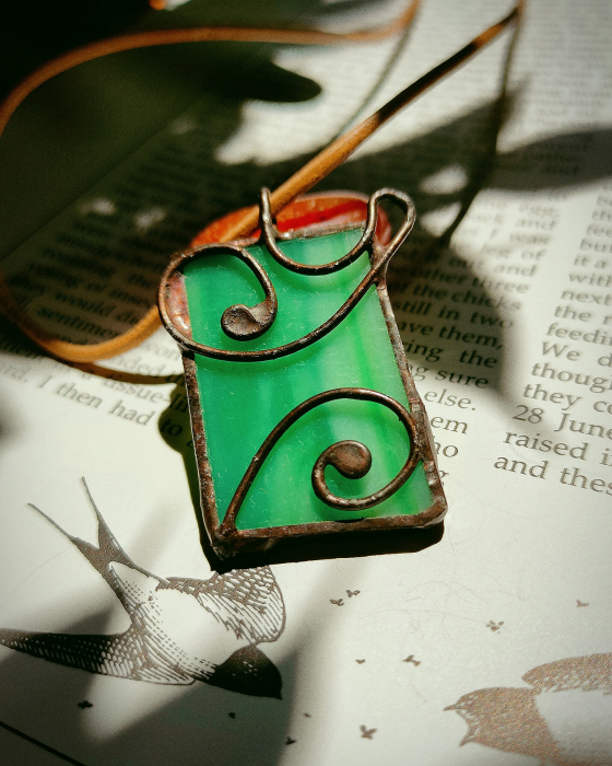 Colier din sticlă Castel opacă de culoare verde. Nu conține plastic. Colierul este unicat, făcut manual. Sticla este colorată in compoziție (nu este vopsită). Colier in tehnică de vitraliu.