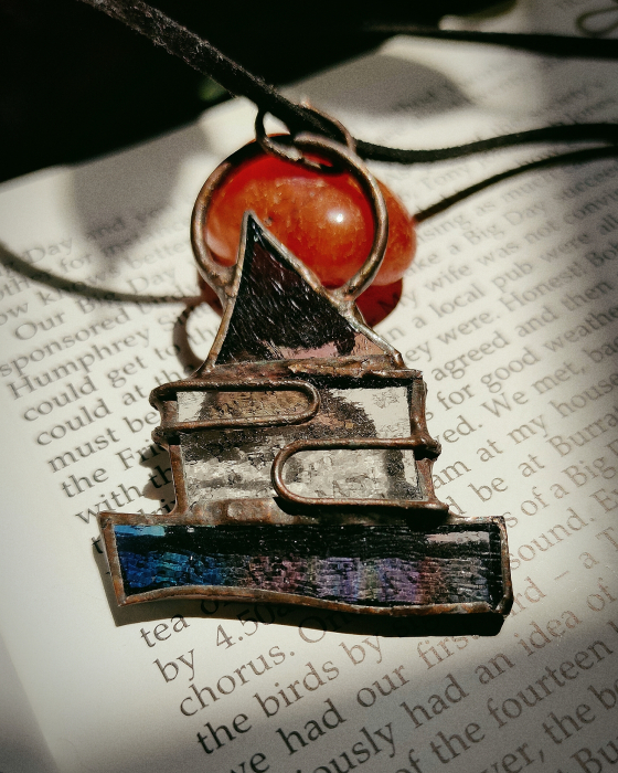 Colier din sticlă Cathedral neagră, transparentă și albastră. Nu conține plastic. Colierul este unicat, facut manual. sticla este colorată in compoziție (nu este vopsită). Colier in tehnică de vitraliu.