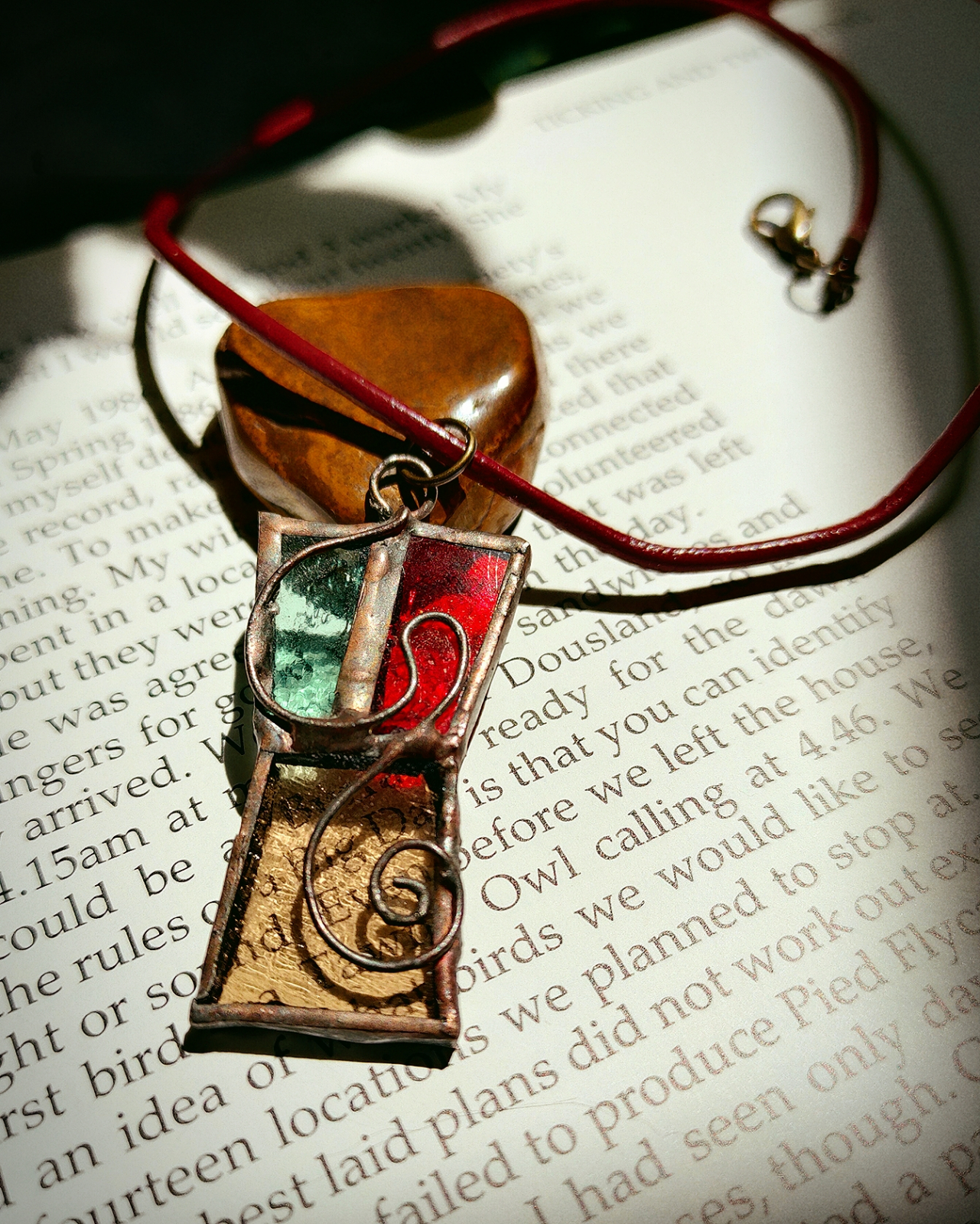 Colier din sticlă Cathedral portocalie, vernil și roșie. Nu conține plastic. Colierul este unicat, facut manual. sticla este colorată in compoziție (nu este vopsită). Colier in tehnică de vitraliu.