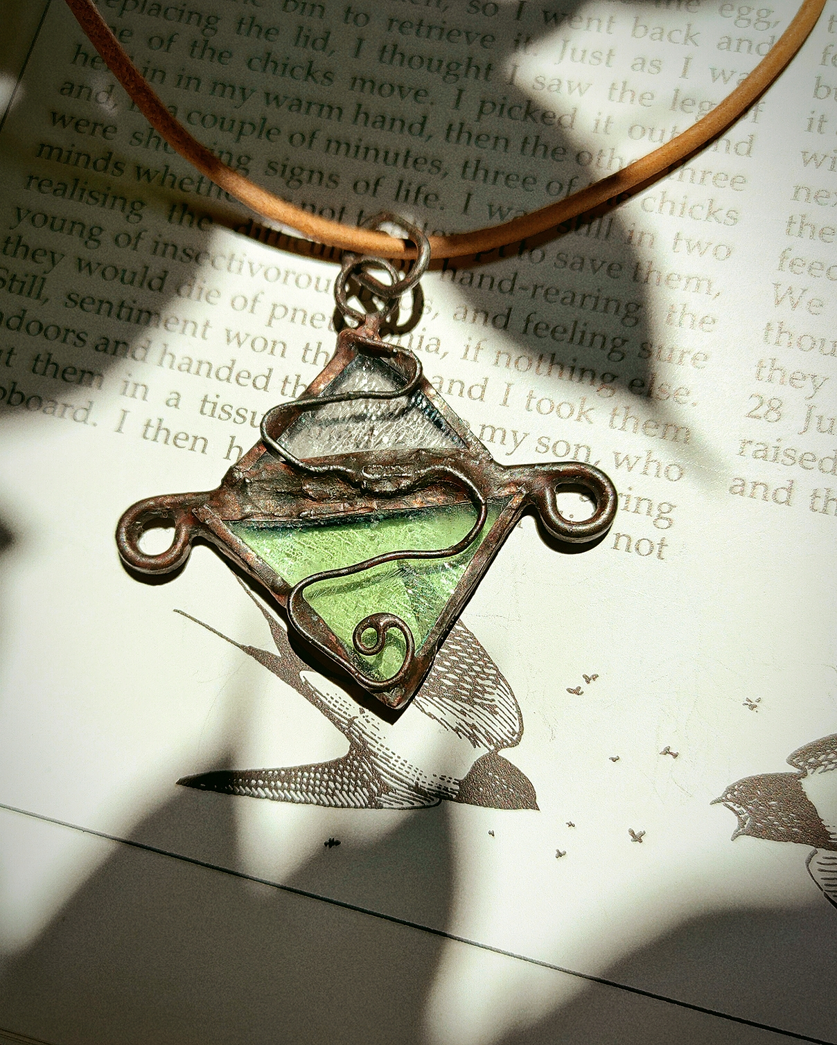 Colier din sticlă Cathedral colorată verde și gri. Nu conține plastic. Colierul este unicat, făcut manual. Sticla este colorată in compoziție (nu este vopsită). Colier in tehnică de vitraliu.