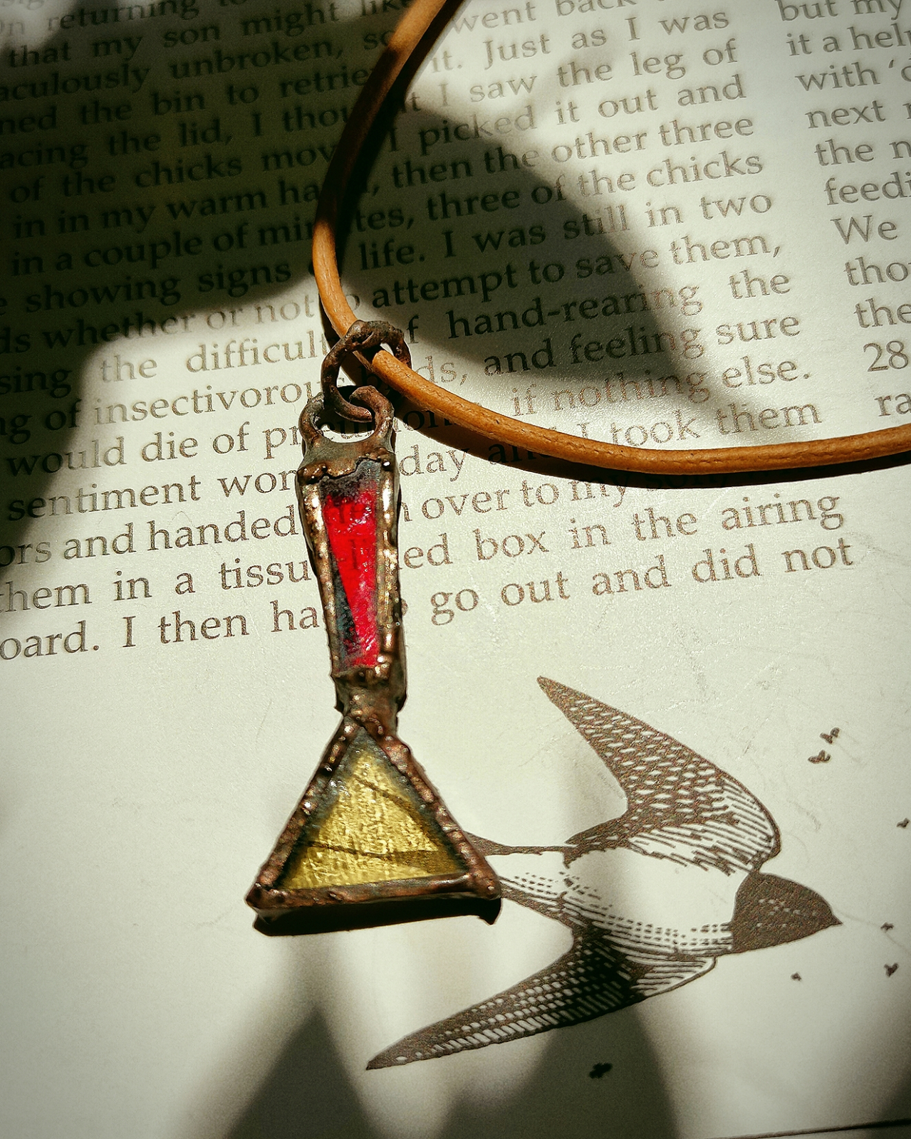 Colier din sticlă Cathedral colorată roșie și galbenă. Nu conține plastic. Colierul este unicat, făcut manual. Sticla este colorată in compoziție (nu este vopsită). Colier in tehnică de vitraliu.