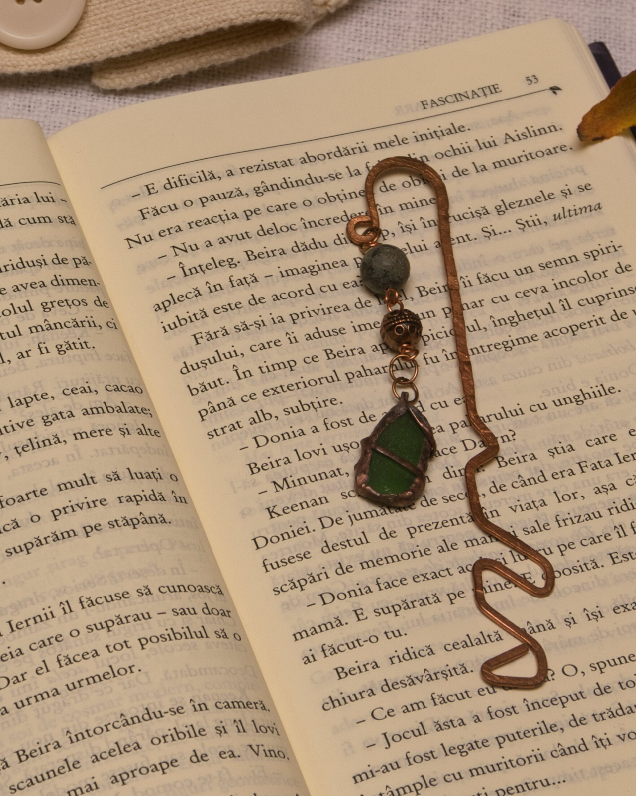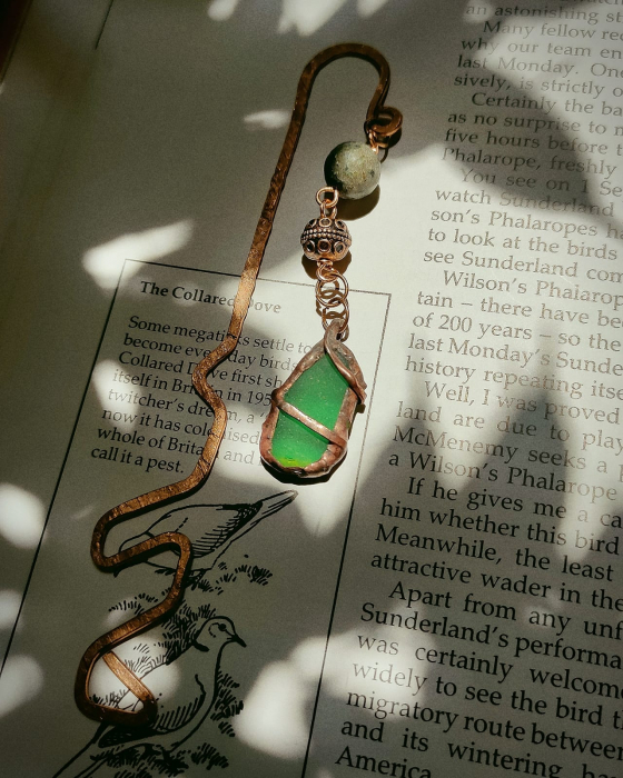 semn de carte din cupru modelat manual, cu ornamente din cupru, jasp si seaglass. (nu conține elemente din plastic)