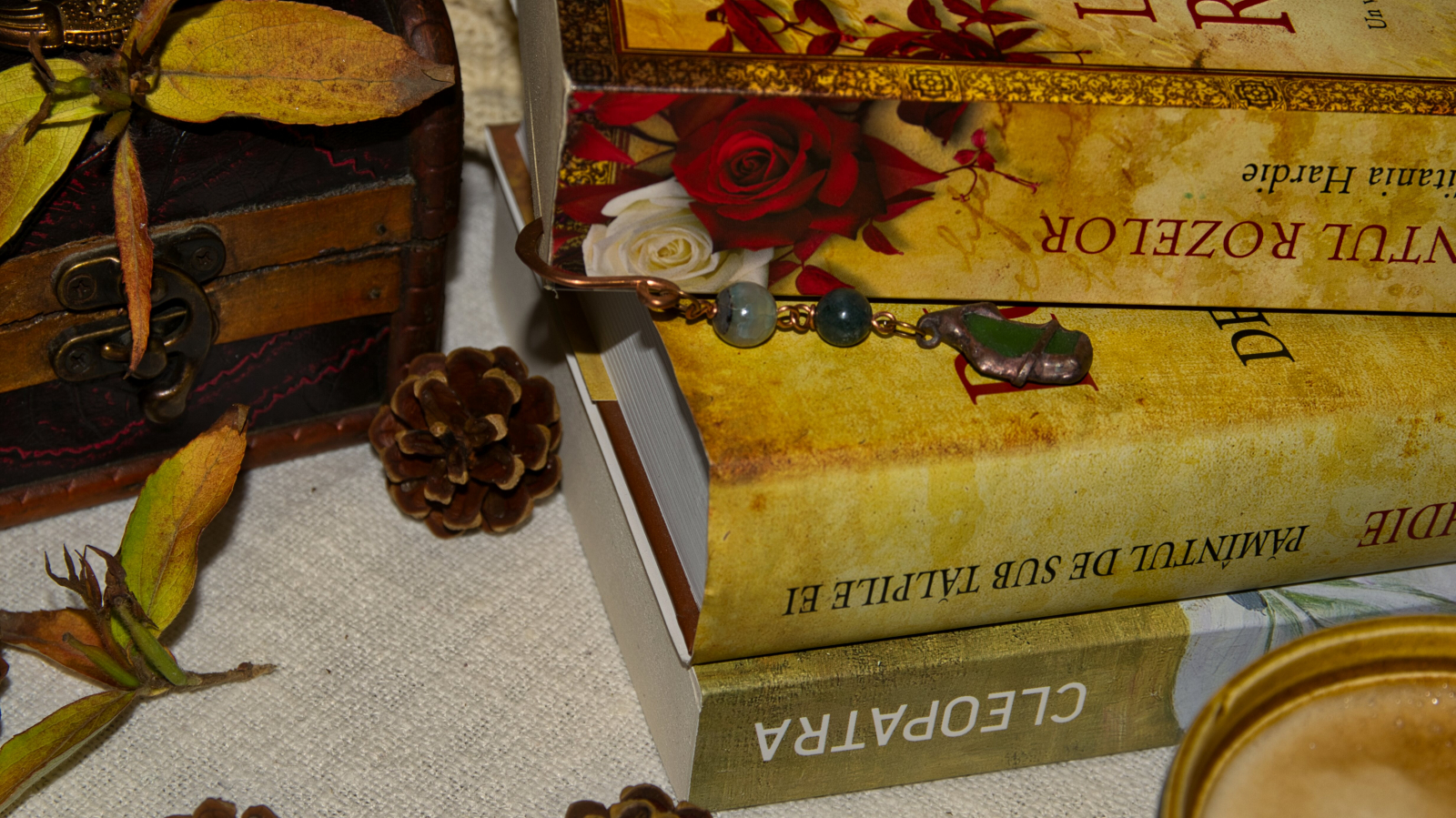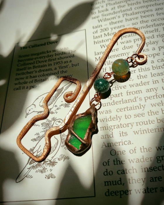 semn de carte din cupru modelat manual, cu jasp verde si seaglass. (nu conține elemente din plastic)
