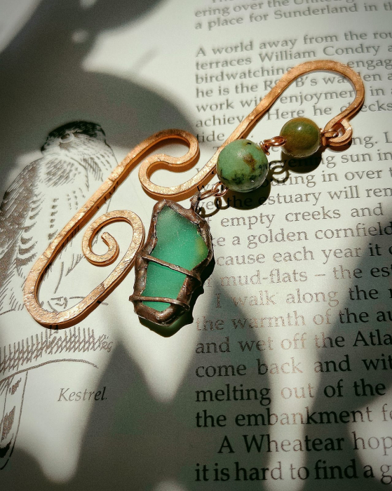 semn de carte din cupru modelat manual, cu jasp verde si seaglass. (nu conține elemente din plastic)