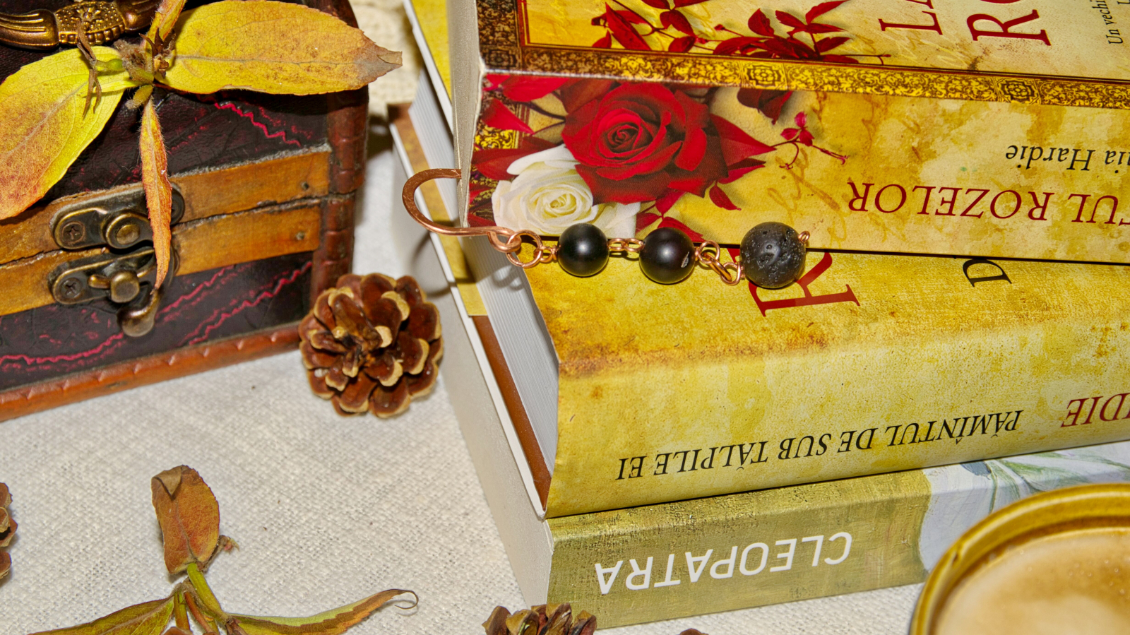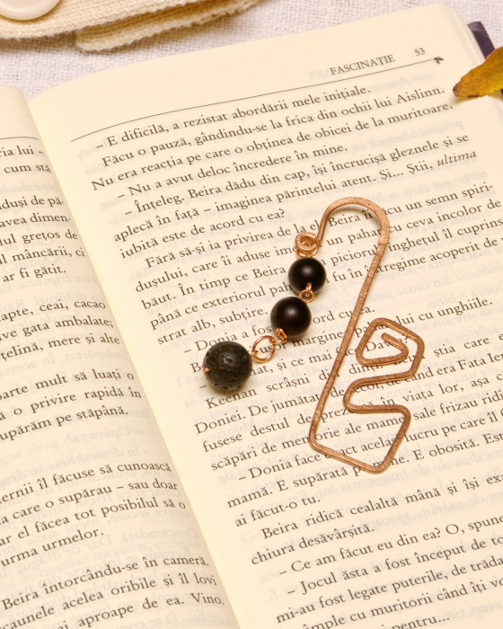 Semn de carte din cupru modelat manual, cu ornamente din lava stone. (nu conține elemente din plastic)