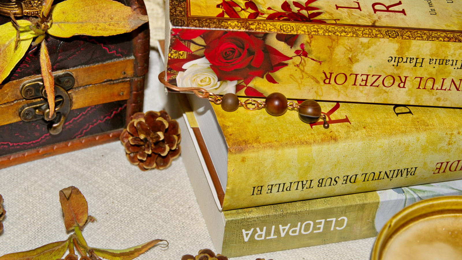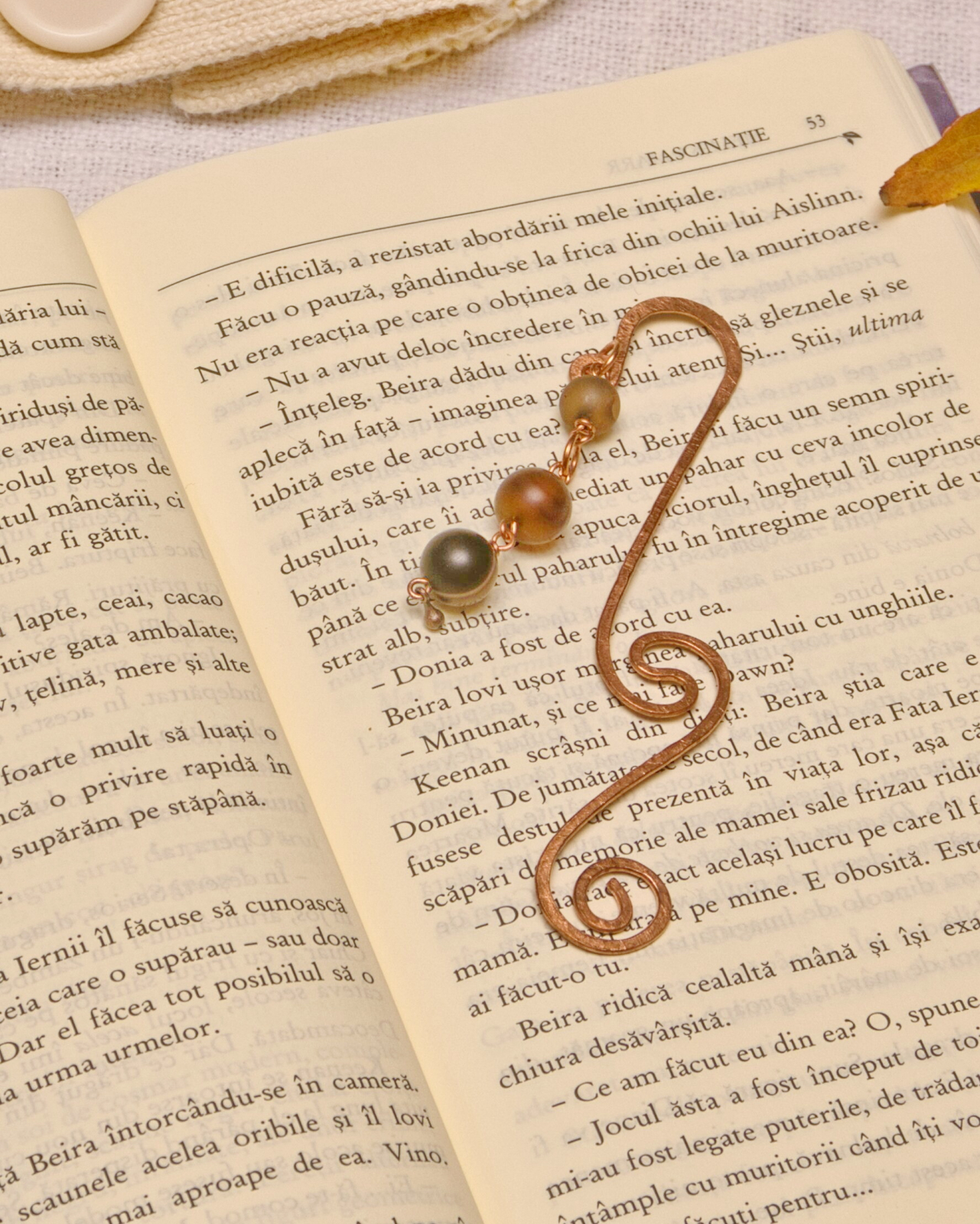 Semn de carte din cupru modelat manual, cu ornamente din agat. (nu conține elemente din plastic)