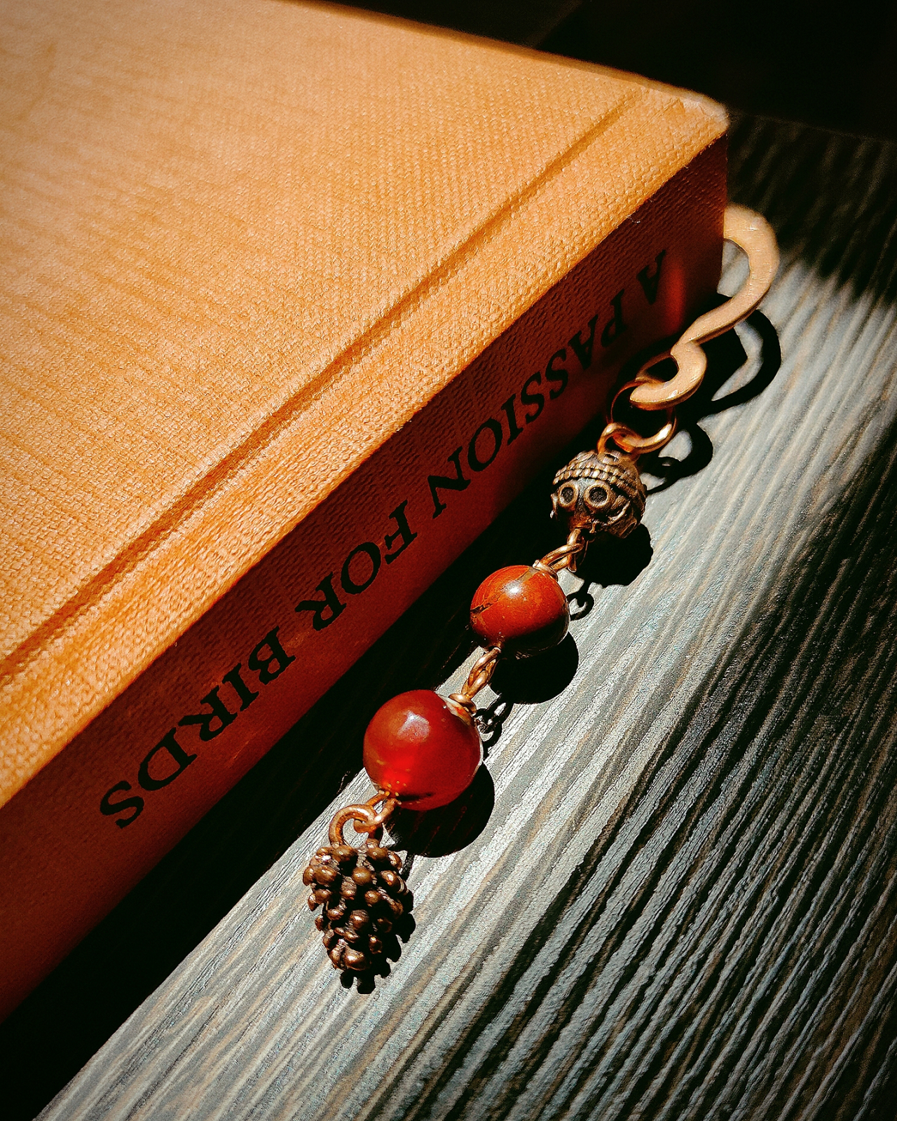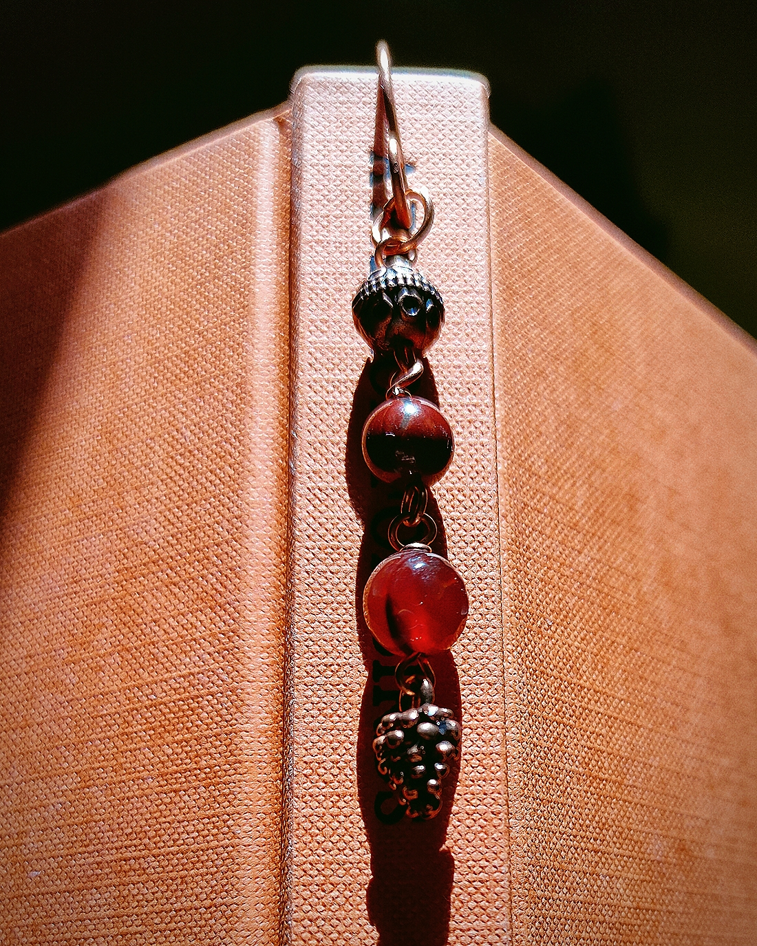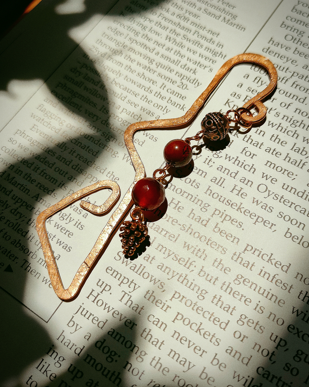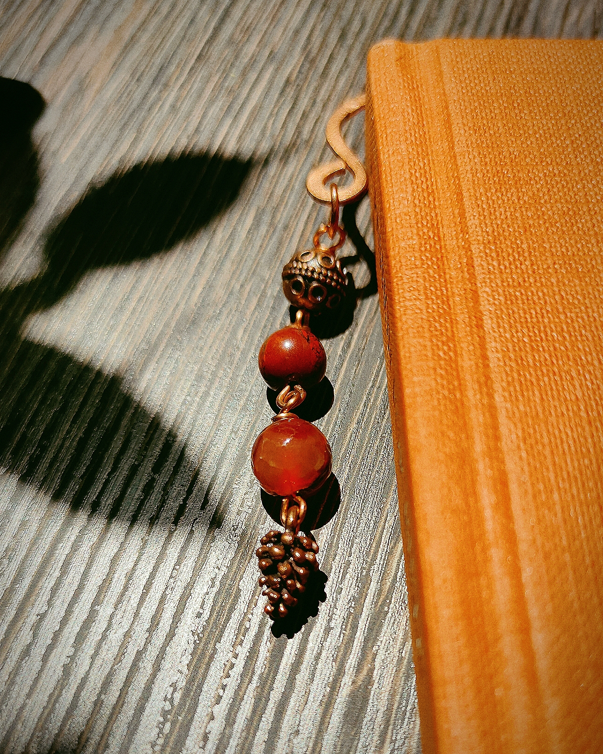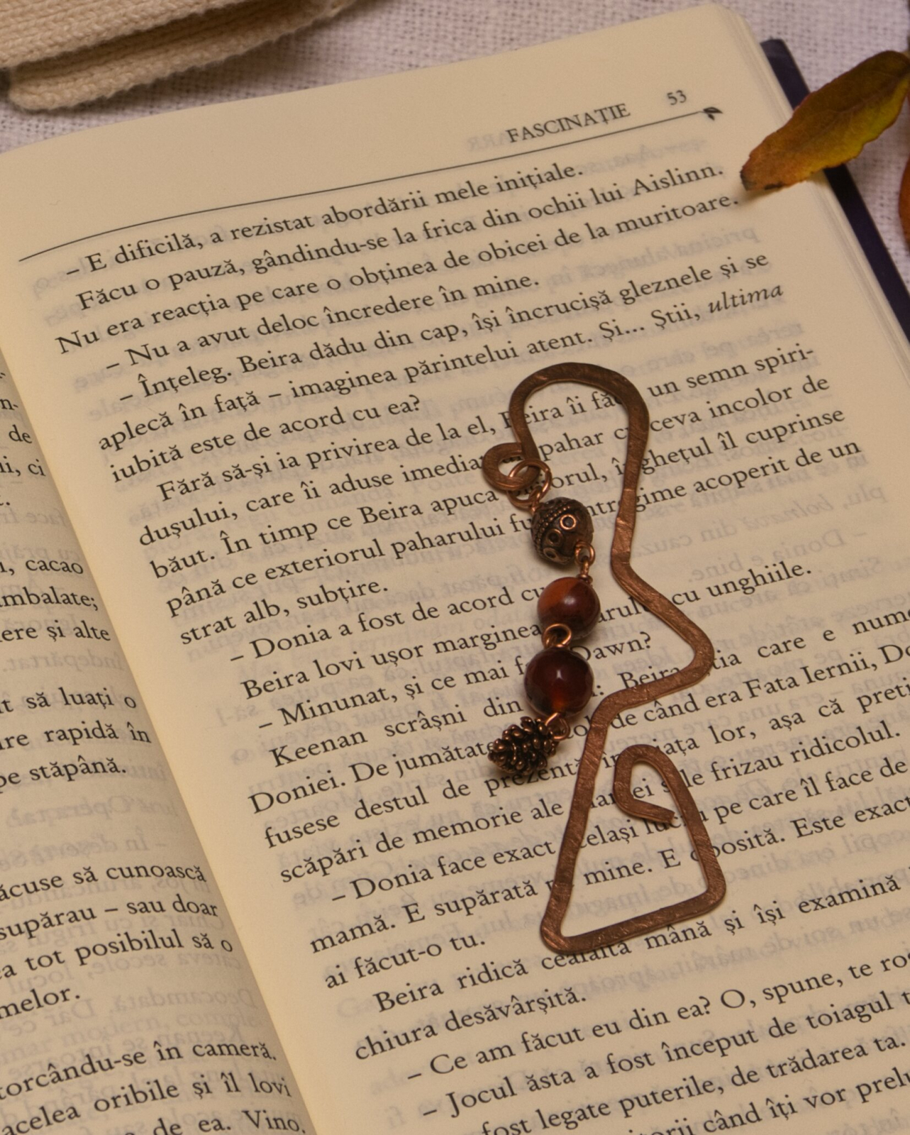 Semn de carte din cupru modelat manual, cu ornamente din jasp rosu. (nu conține elemente din plastic)