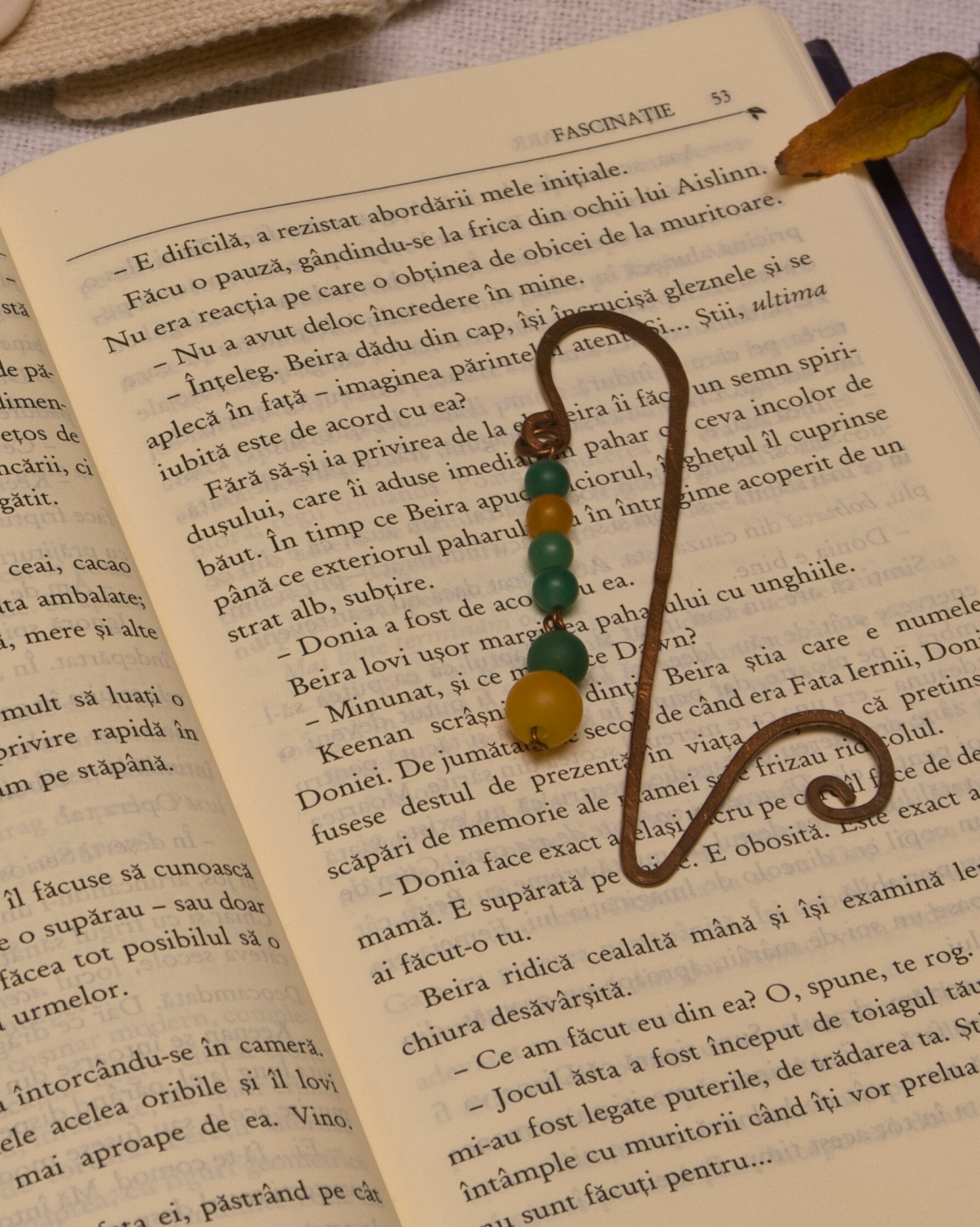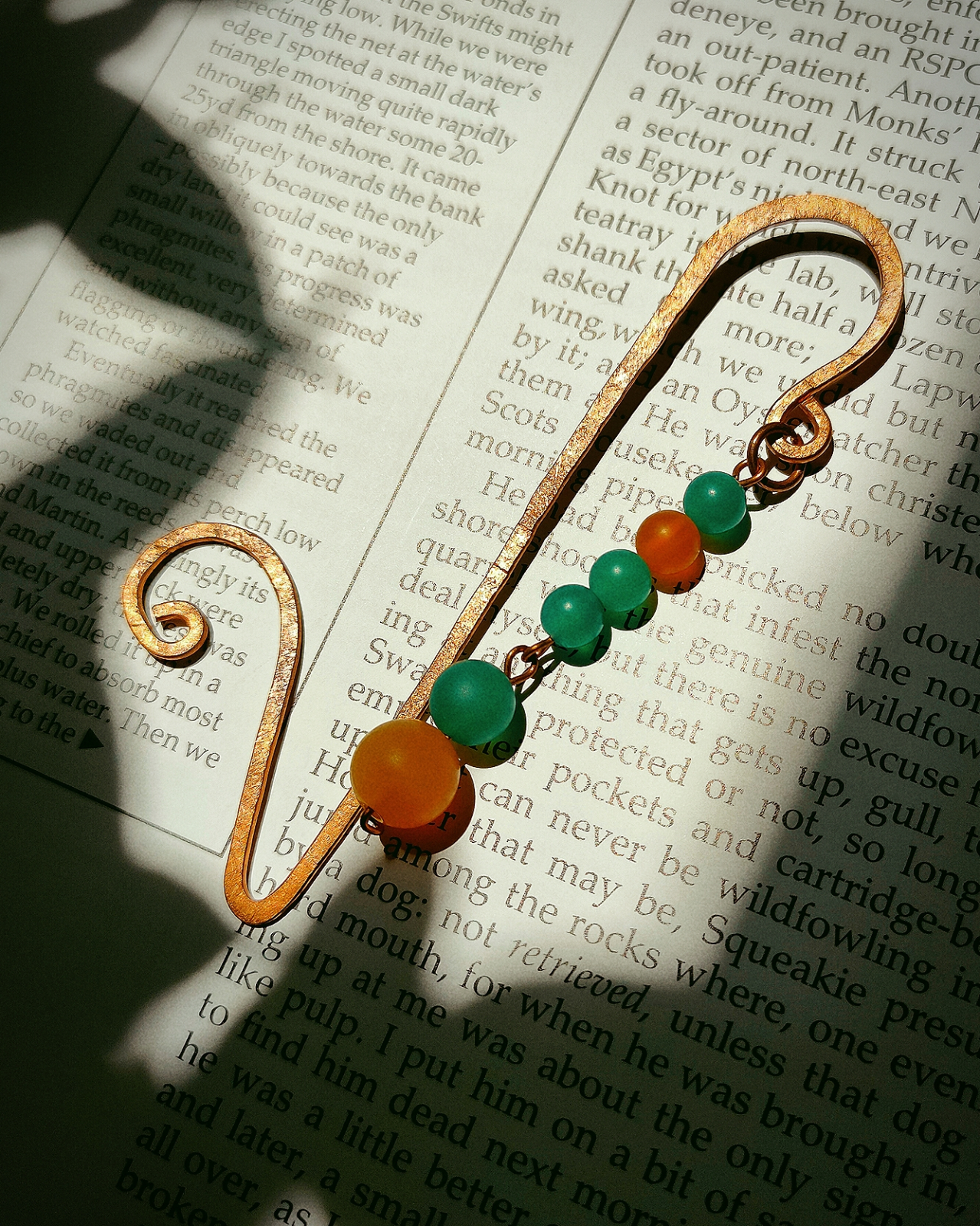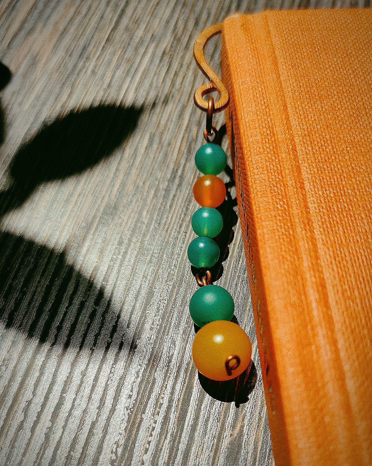 Semn de carte din cupru modelat manual, cu ornamente din jad mat vernil și gălbui. (nu conține elemente din plastic)