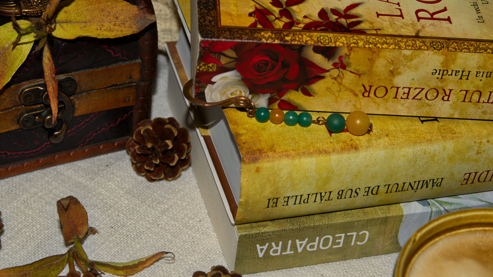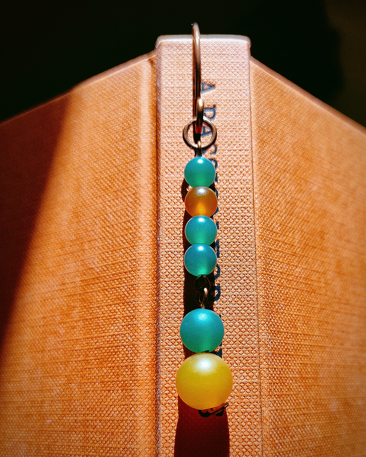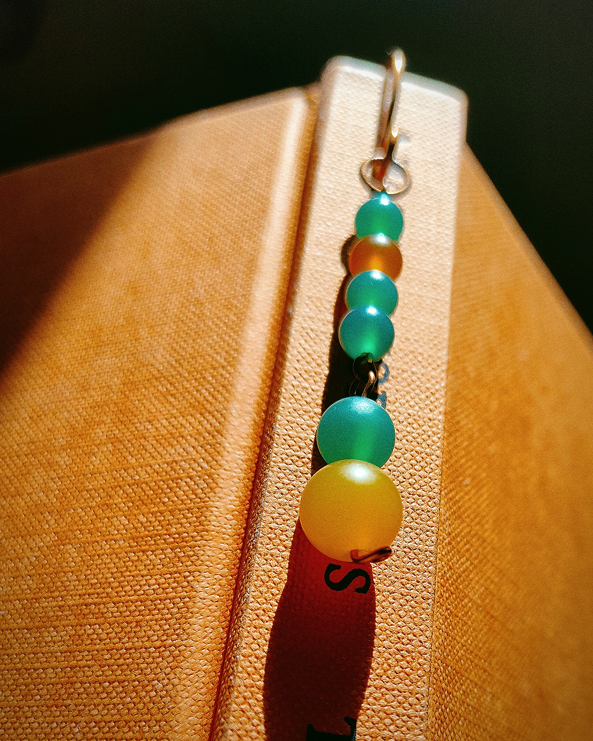 Semn de carte din cupru modelat manual, cu ornamente din jad mat vernil și gălbui. (nu conține elemente din plastic)