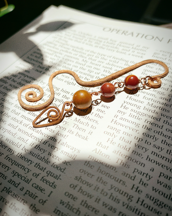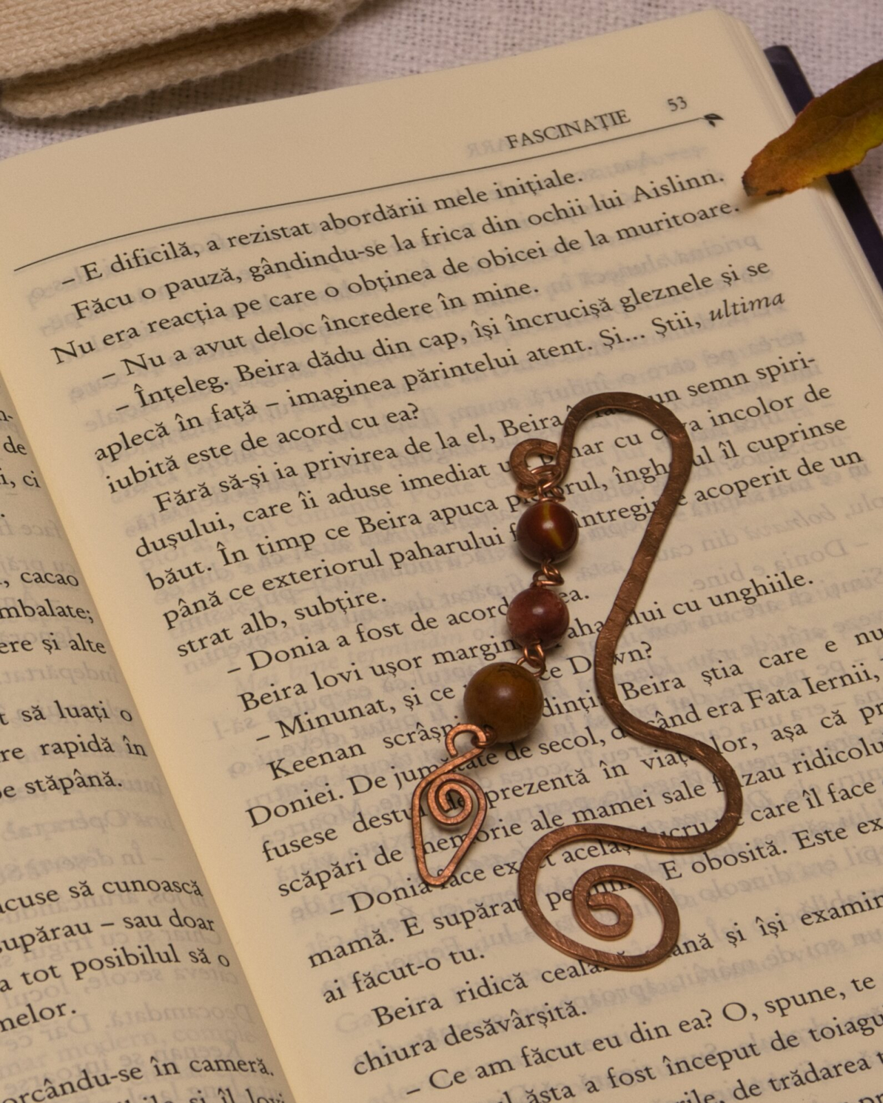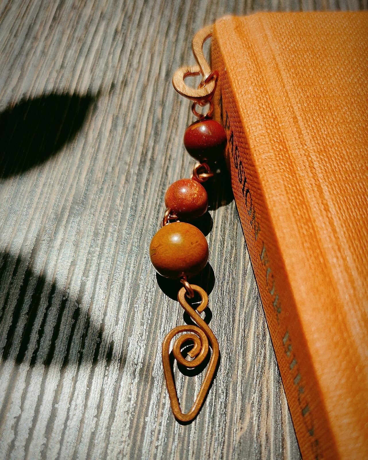 Semn de carte din cupru modelat manual, cu ornamente din jasp rosu. (nu conține elemente din plastic)