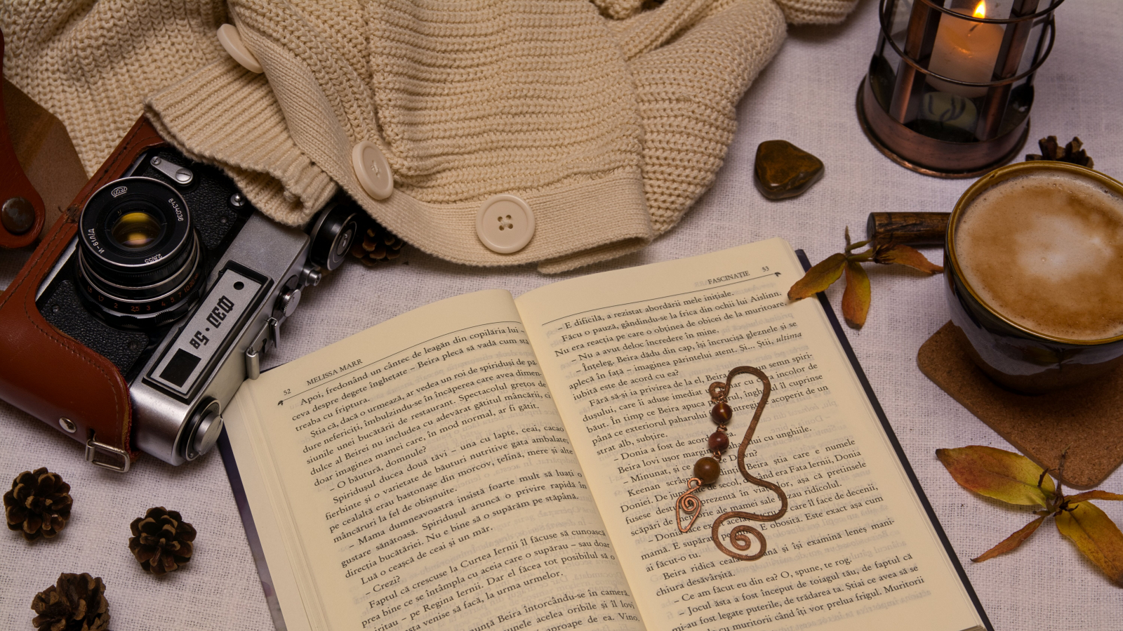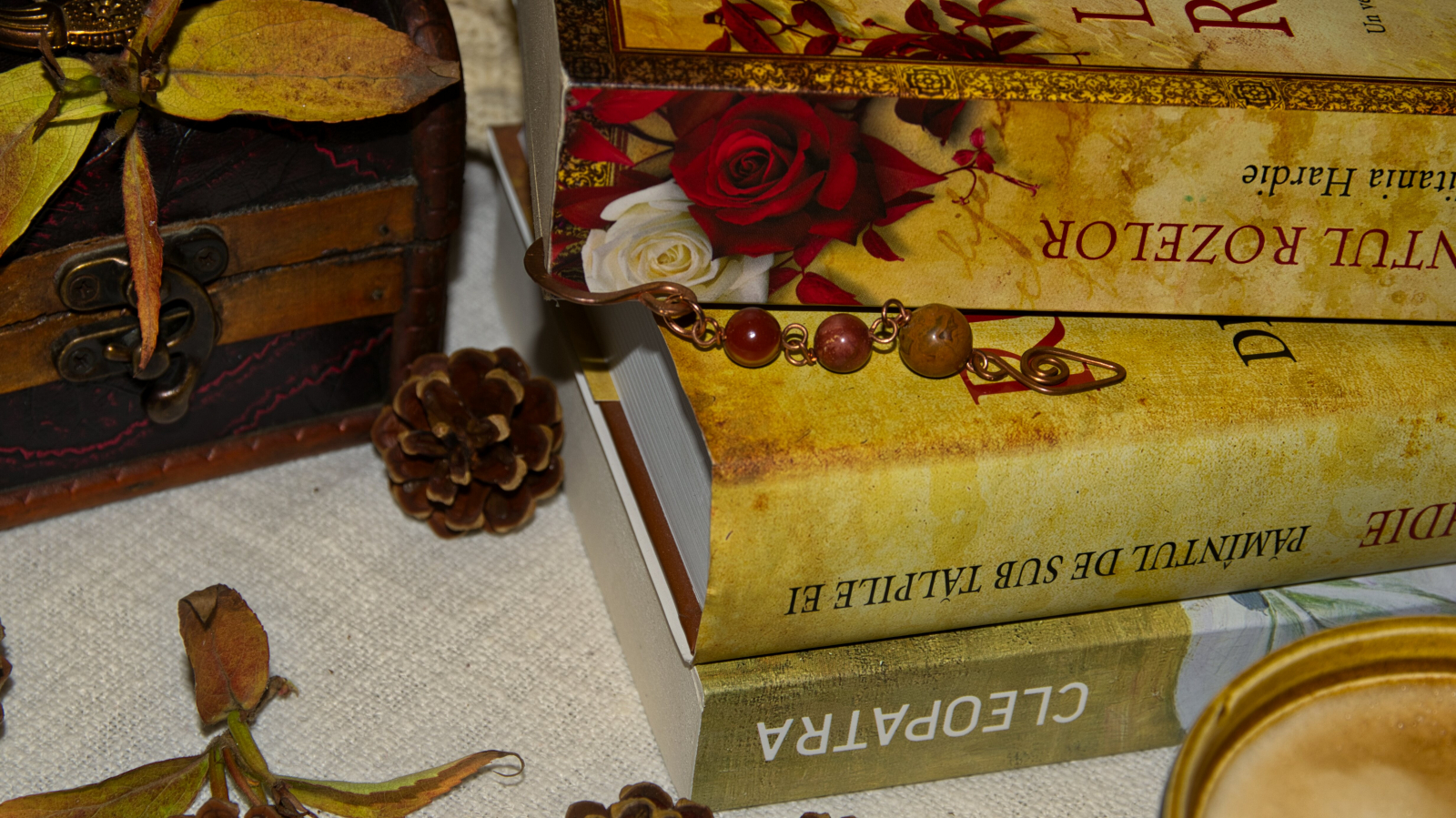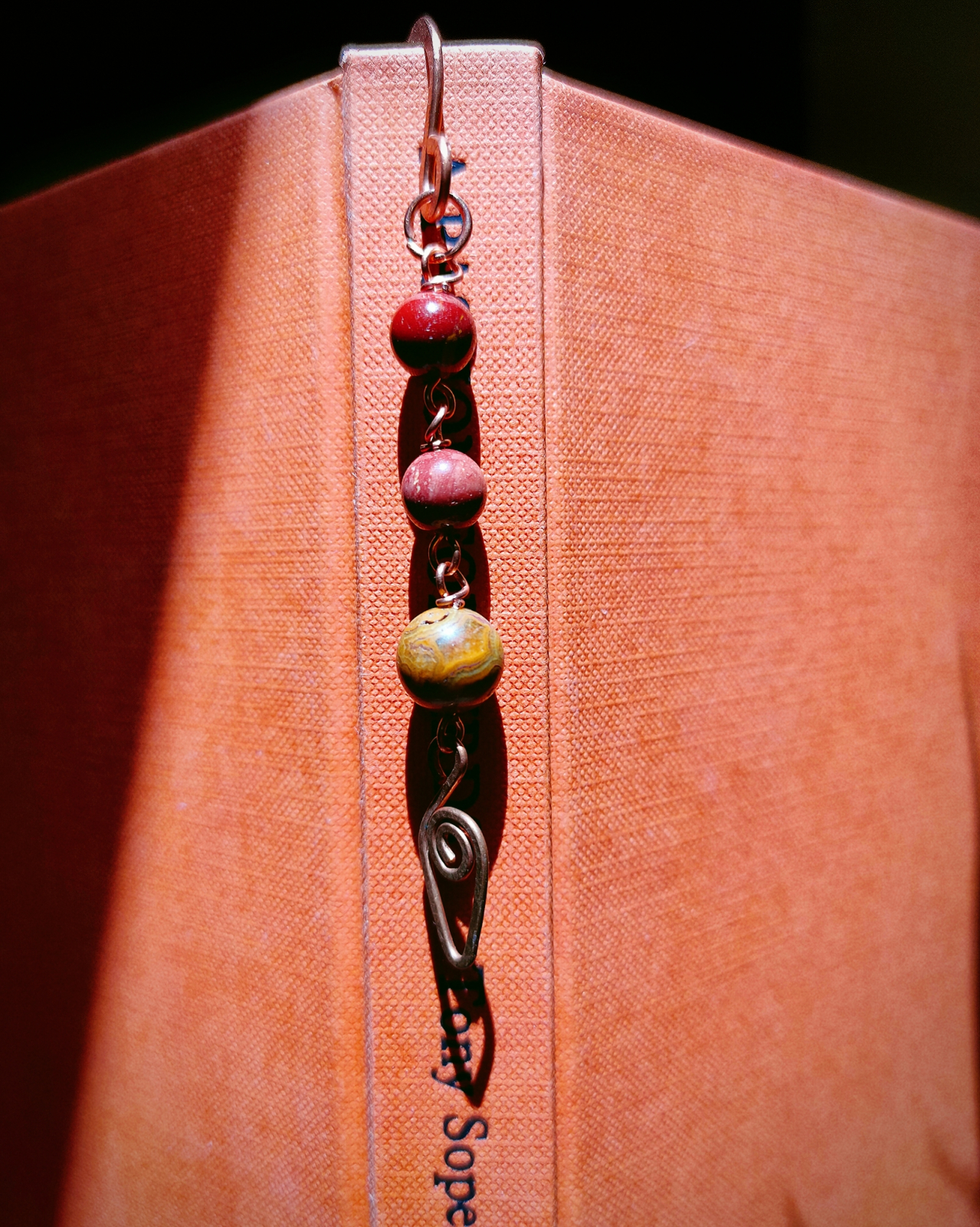 Semn de carte din cupru modelat manual, cu ornamente din jasp rosu. (nu conține elemente din plastic)
